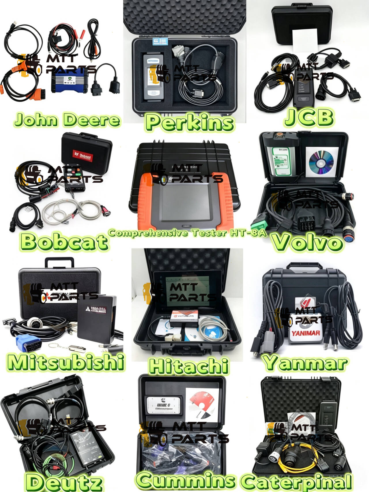 To, co się wyróżnia, to ich praktyczny wygląd. Żadnych ogólnych narzędzi, które mogłyby nie działać w połowie; są to konfiguracje specyficzne dla marki, które łączą się prawidłowo i dostarczają faktycznie potrzebne dane. Na środku znajduje się nawet kompleksowy tester typu „wszystko w jednym” (HT-8A) oraz opcje dla marek, dla których nieco trudniej jest znaleźć dobrą diagnostykę, takich jak Yanmar czy Bobcat.